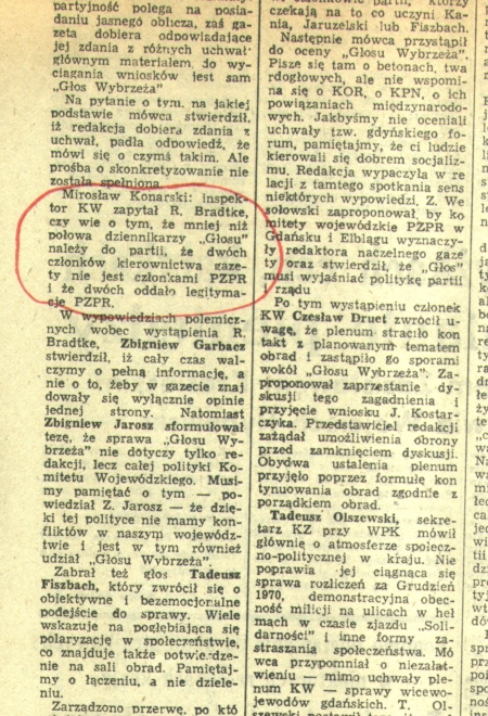 |  | Sierpień 1980 roku zastał mnie wśród dziennikarzy „Głosu Wybrzeża”. Byłem wtedy zastępcą sekretarza redakcji. Gazeta szybko zyskiwała – obok „Gazety Krakowskiej” (także organu PZPR) – miano najrzetelniej informującego polskiego dziennika. Kolejkowicze w kioskach „RUCH” (co utrwalił Zbyszek Kosycarz) wyrywali sobie nie tylko papierosy – także „Głos”...