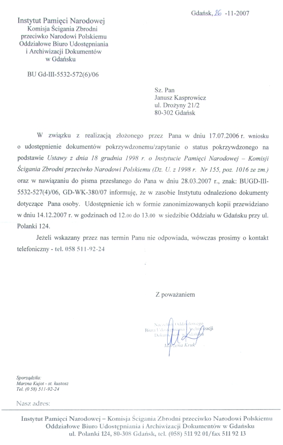 Po lekturze tekstu samoistnie zaoferował swą pomoc Radny RMG z PiS Krzysztof Wiecki. Dziękuję w imieniu swoim i Zainteresowanych. Mam jednak nadzieję, że dalsze interwencje nie będą już konieczne. Zatelefonował do mnie bowiem także nowo mianowany Z-ca Prezydenta Gdańska Pan Maciej Lisicki, zapewniając o swej dobrej woli dania Państwu D. oczekiwanego wsparcia. Ta deklaracja ma dla mnie wielką wagę.